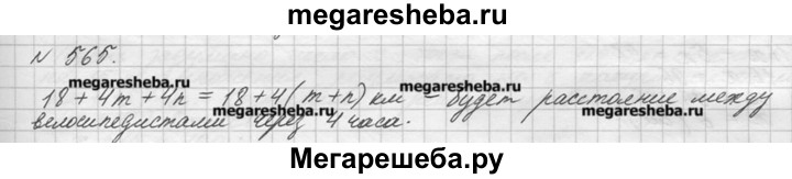 565. Расстояние между двумя сёлами 18 км. Из них выехали в противоположные стороны два велосипедиста. Один проезжает в час т км, а другой — л км. Какое расстояние будет между ними через 4 ч?