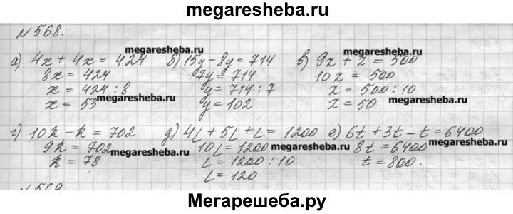 568. Решите уравнение: а) 4х + 4х = 424; в) 9z + z = 500; б) 15у - 8у = 714; г) 10k - k = 702; д) 4l + 5l + l = 1200; е) 6t + 3t - t = 6400.