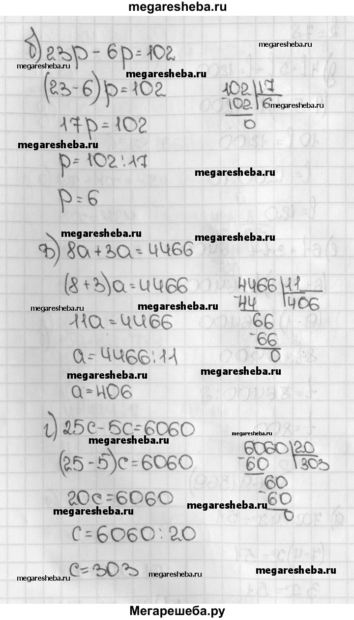 569. Найдите, при каком значении буквы: а) выражение 7х больше 4х на 51; б) выражение 6р меньше 23р на 102; в) сумма 8а и За равна 4466; г) разность 25с и 5с равна 6060.
