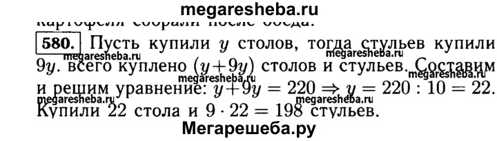 580. Для школы купили 220 столов и стульев, причём стульев — в 9 раз больше, чем столов. Сколько столов и сколько стульев купили?