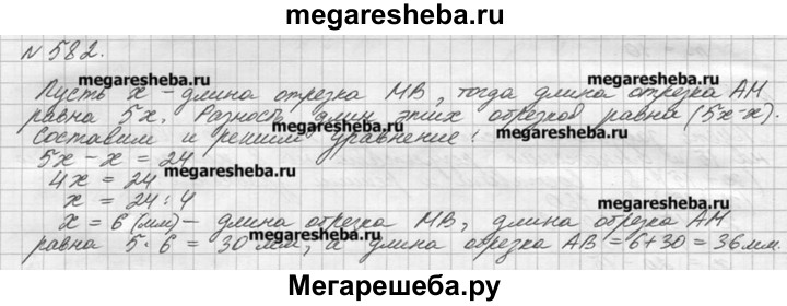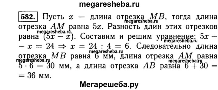 582. Точка М делит отрезок АВ на два отрезка: AM и MB. Отрезок AM длиннее отрезка MB в 5 раз, а отрезок MB короче отрезка AM на 24 мм. Найдите длину отрезка AM, длину отрезка MB и длину отрезка АВ.