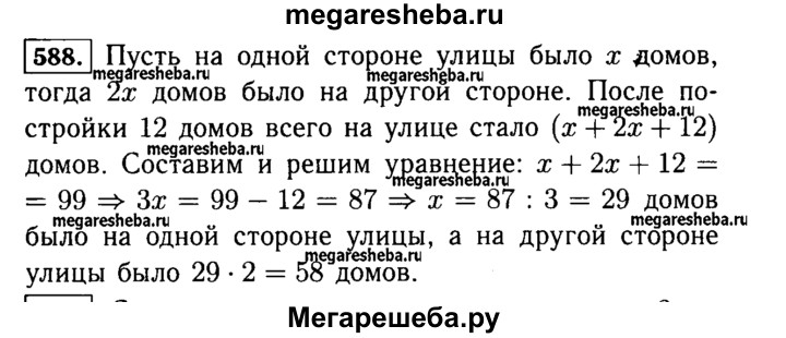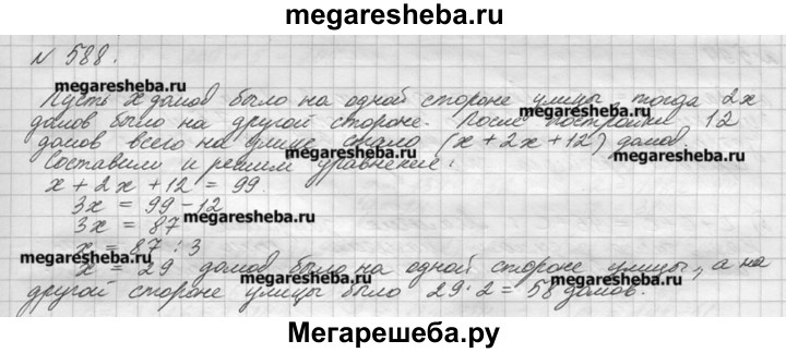 588. На одной стороне улицы вдвое больше домов, чем на другой. Когда на улице построили ещё 12 домов, то всего стало 99 домов. Сколько домов было на каждой стороне улицы?