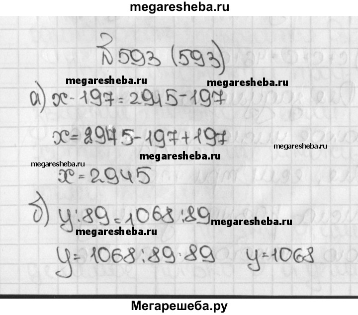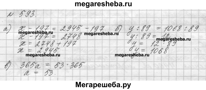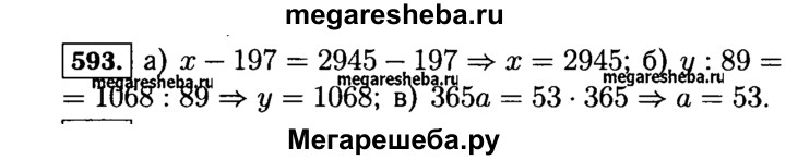 593. Угадайте корни уравнения: а) х - 197 = 2945 - 197; б) у : 89 = 1068 : 89; в) 365а = 53 * 365.