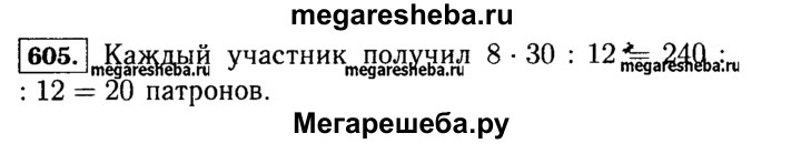 605. В соревнованиях по стрельбе участвовали 12 человек. Сколько патронов получил каждый участник, если потребовалось 8 коробок, по 30 патронов в каждой?