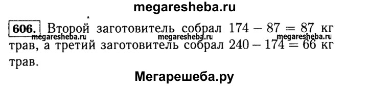606. Три заготовителя собрали 240 кг лекарственных трав. Первый собрал 87 кг, а первый и второй вместе — 174 кг. Сколько килограммов лекарственных трав собрал второй заготовитель и сколько третий?
