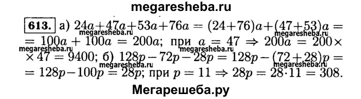 613. Найдите значение выражения: а) 24а + 47а + 53а + 76а, если а = 47; б) 128р - 72р - 28р, если р = 11.