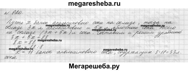 620. На складе всего 88 л сока; трёхлитровых банок апельсинового сока столько же, сколько пятилитровых банок яблочного сока. Сколько литров апельсинового сока на складе?