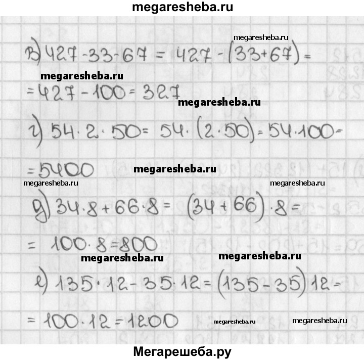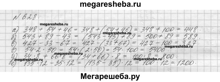 628. Измените порядок действий на основании свойств сложения, вычитания и умножения для удобства вычислений: а) 348 + 54 + 46; г) 54 * 2 * 50; б) 543 + 89 - 43; д) 34 * 8 + 66 * 8; в) 427 - 33 - 67; е) 135 * 12 - 35 * 12.