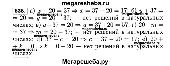 635. Решите уравнение: а) х + 20 = 37; б) у + 37 = 20; в) а - 37 = 20; г) 20 - m = 37; д) 37 - с = 20; е) 20 + k = 0.