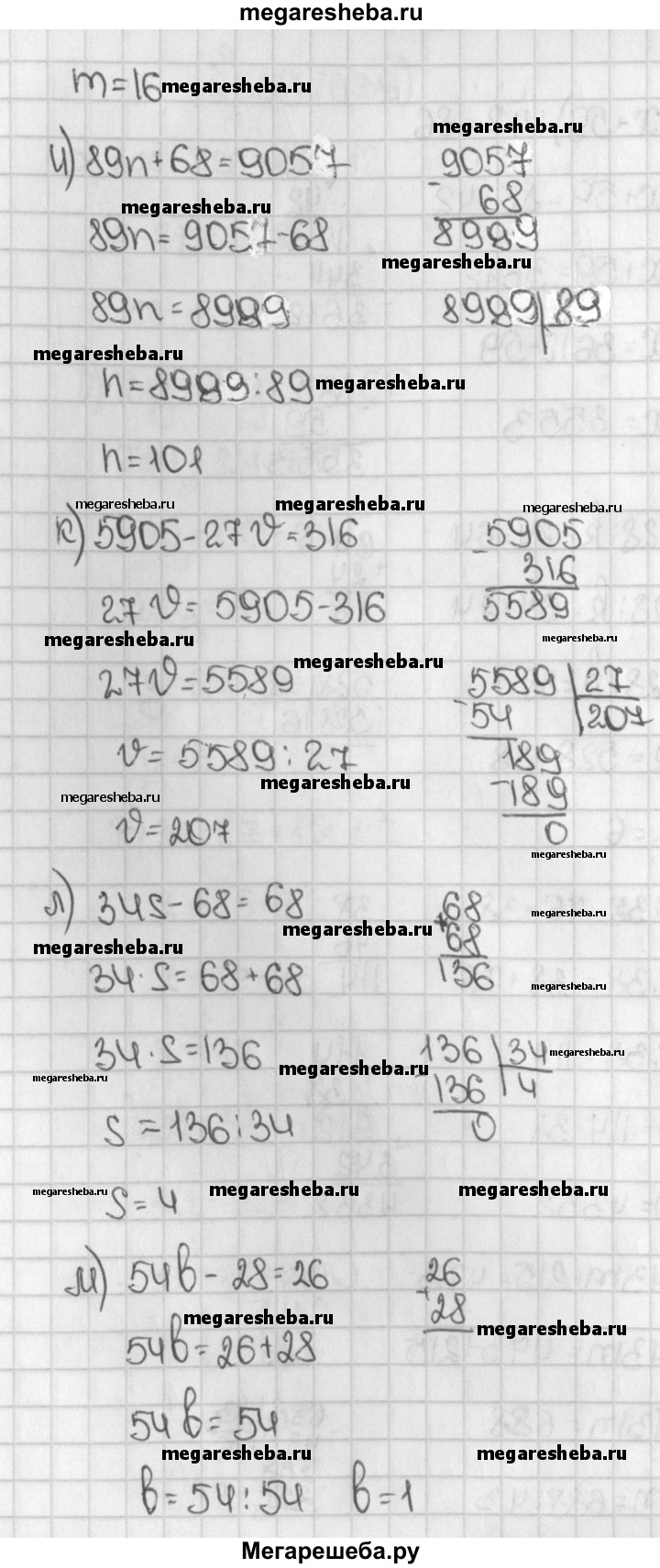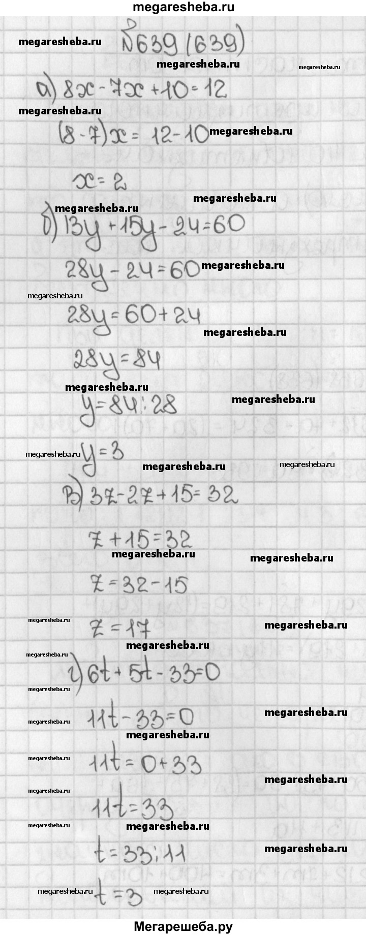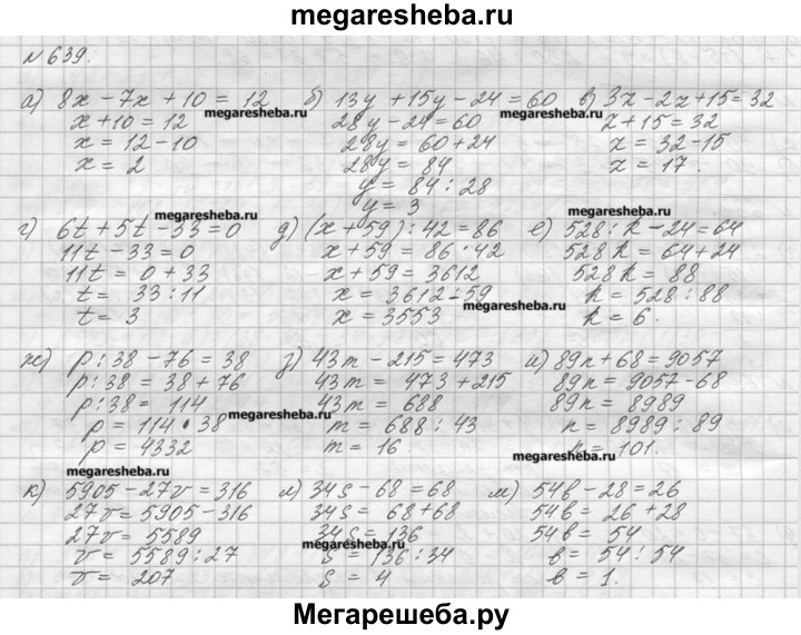 639. Решите уравнение: а) 8х - 7х + 10 = 12; б) 13у + 15у - 24 = 60; в) 3z - 2z + 15 = 32; г) 6t + 5t - 33 = 0; д) (х + 59) : 42 = 86; е) 528 : k - 24 = 64; ж) р : 38 - 76 = 38; з) 43m - 215 = 473; и) 89п + 68 = 9057; к) 5905 - 27ʋ = 316; л) 34s - 68 = 68; м) 54b - 28 = 26.