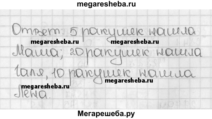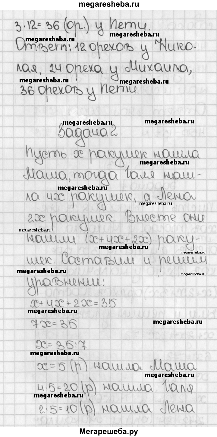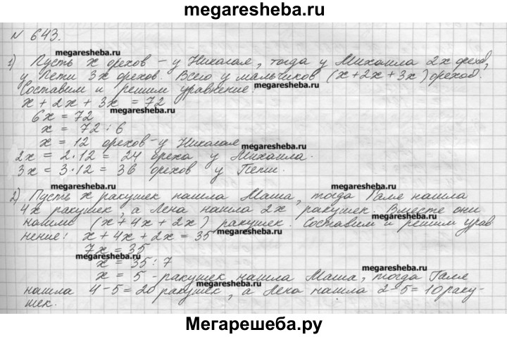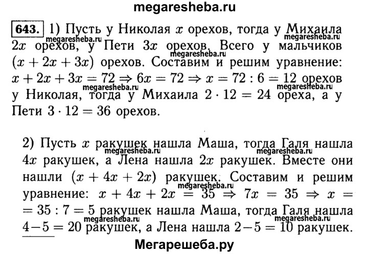 643. Решите с помощью уравнения задачу: 1) У Михаила в 2 раза больше орехов, чем у Николая, а у Пети в 3 раза больше, чем у Николая. Сколько орехов у каждого, если у всех вместе 72 ореха? 2) Три девочки собрали на берегу моря 35 ракушек. Галя нашла в 4 раза больше, чем Маша, а Лена — в 2 раза больше, чем Маша. Сколько ракушек нашла каждая девочка?
