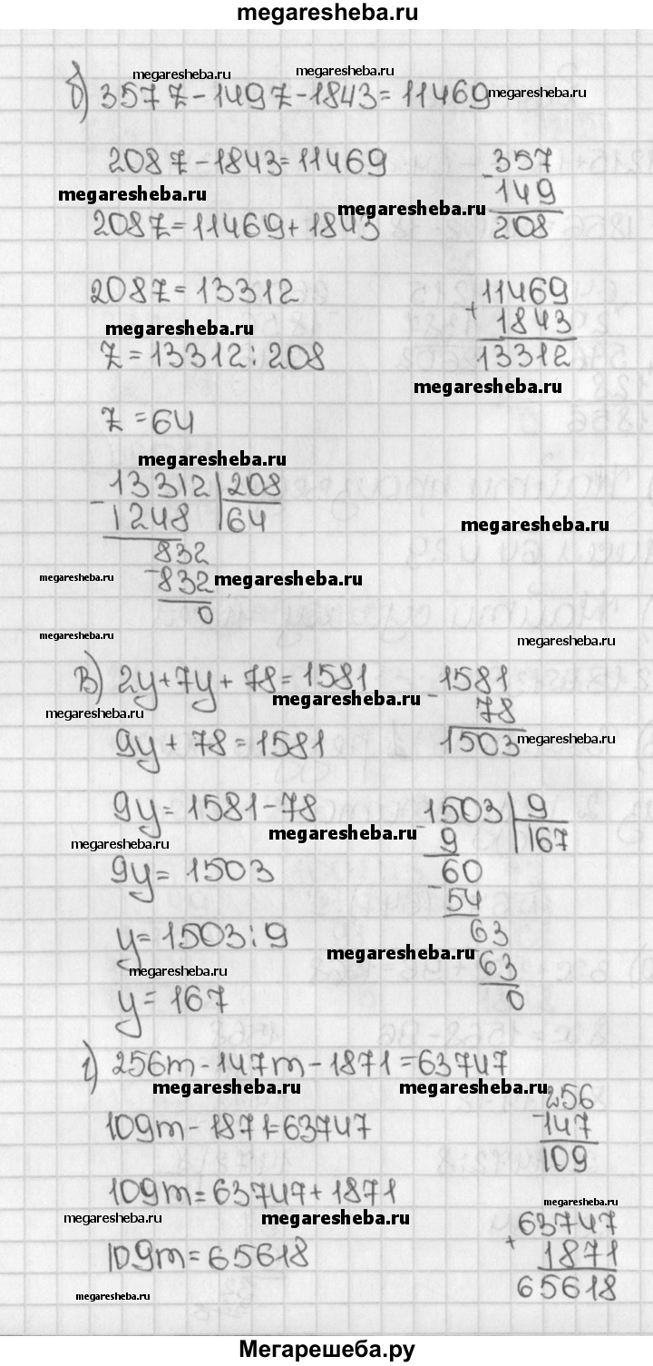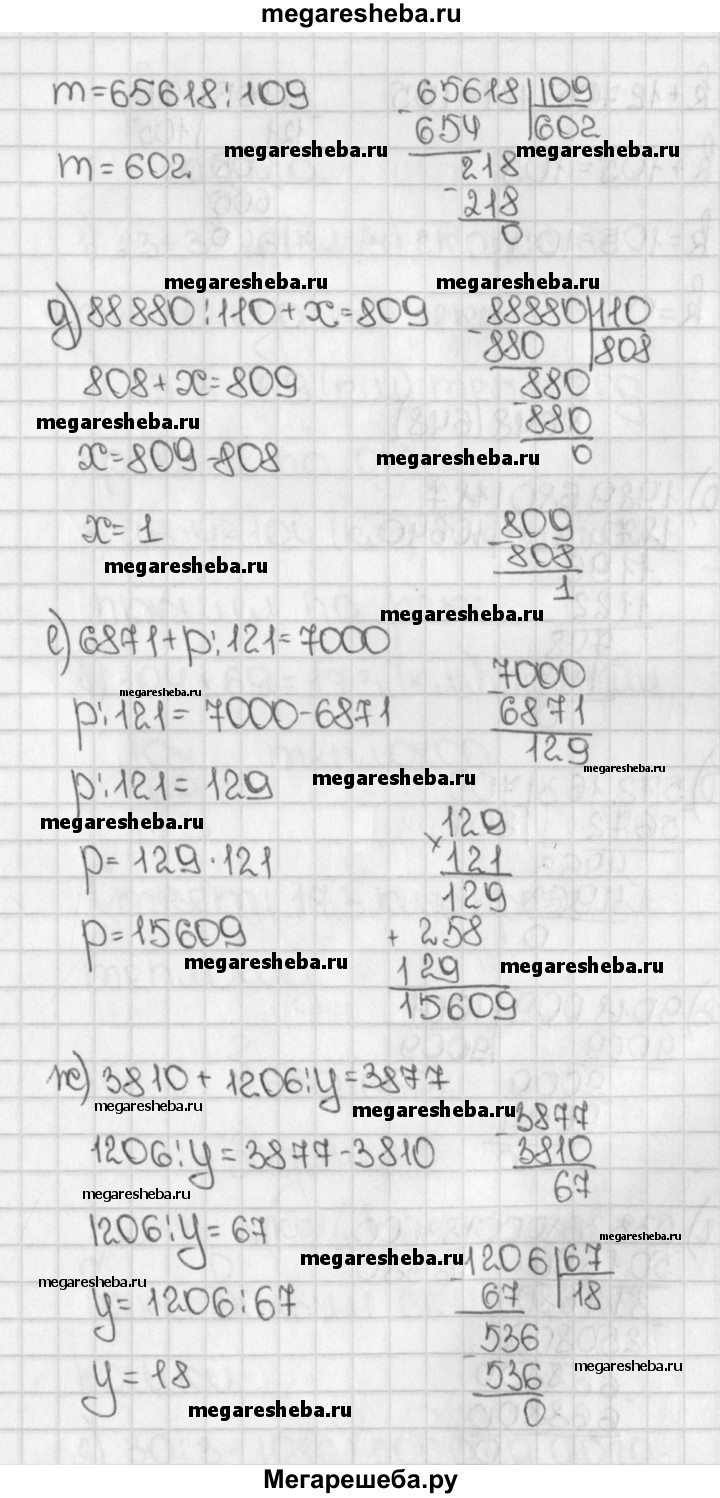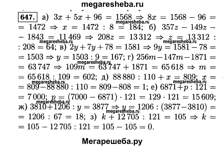 647. Решите уравнение: а) Зx + 5х + 96 = 1568; д) 88 880 : 110 + х = 809; б) 357z – 149z - 1843 = 11 469; е) 6871 + р : 121 = 7000; в) 2у + 1у + 78 = 1581; ж) 3810 + 1206 : у = 3877; г) 256m – 147m - 1871 = 63 747; з) k + 12 705 : 121 = 105.