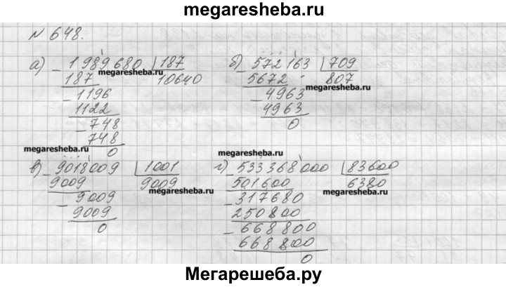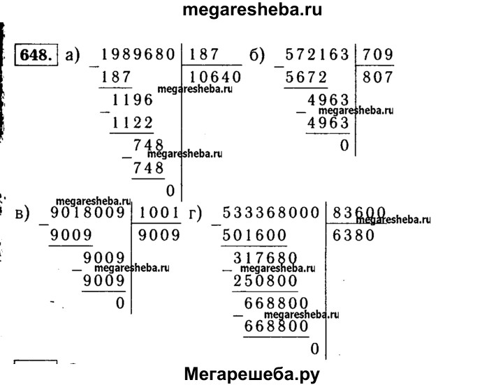 648. Найдите частное: а) 1 989 680 : 187; в) 9 018 009 : 1001; б) 572 163 : 709; г) 533 368 ООО : 83 600.