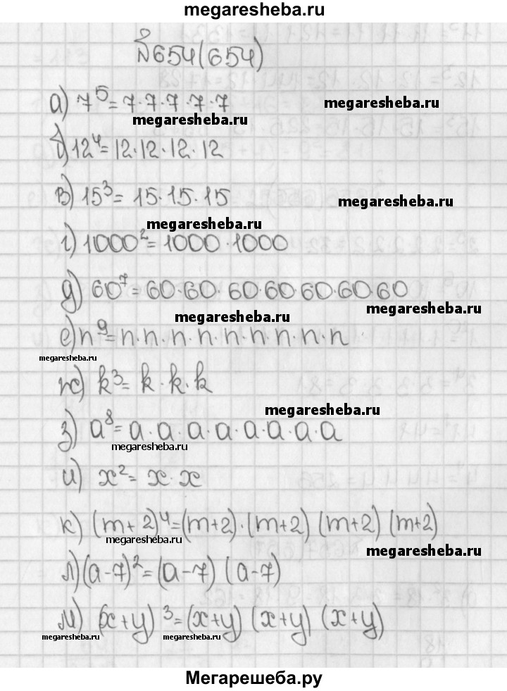 654. Представьте в виде произведения степень: а) 75; г) 10002; ж) k3; к) (т + 2)4; б) 124; д) 607; з) а8; л) (а - 7)2; в) 153; е) n9; и) x2; м) (x+ у)3.