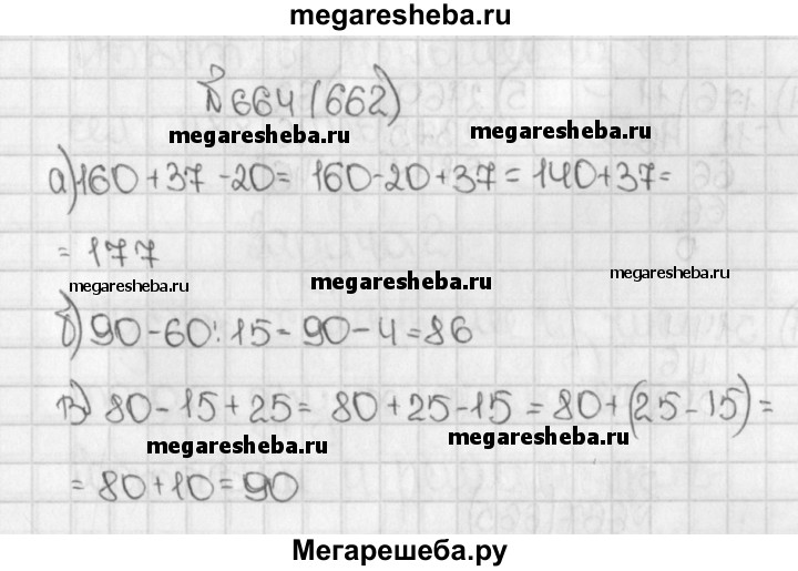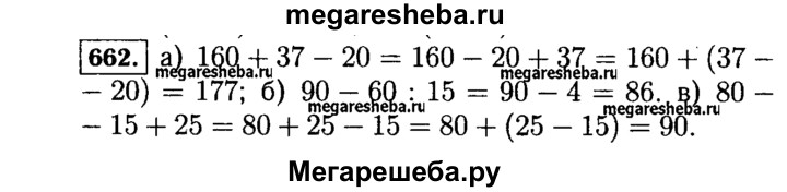 662. Каков порядок выполнения действий при вычислении значения выражения: а) 160 + 37 - 20; 6)90 - 60:15; в) 80 - 15 + 25? Если возможно, укажите другой порядок действий, приводящий к тому же результату.