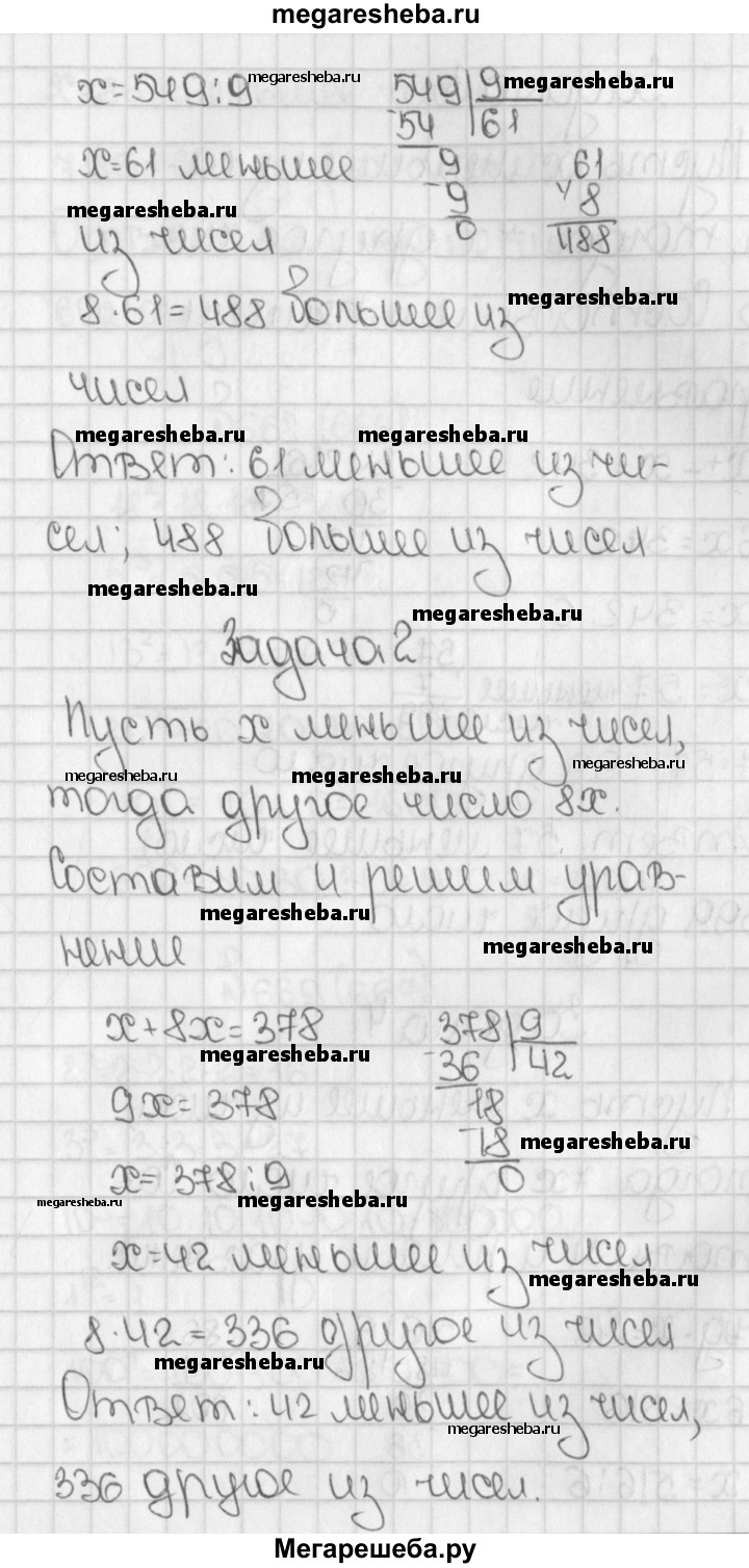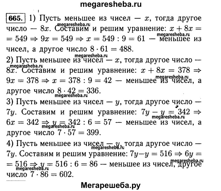 665. Решите задачу: 1) Сумма двух чисел 549. Одно из них в 8 раз больше другого. Найдите эти числа. 2) Сумма двух чисел 378. Одно из них в 8 раз меньше другого. Найдите эти числа. 3) Разность двух чисел 342. Одно из них в 7 раз меньше другого. Найдите эти числа. 4) Разность двух чисел 516. Одно из них в 7 раз больше другого. Найдите эти числа.