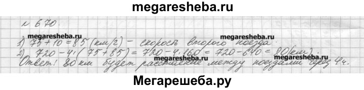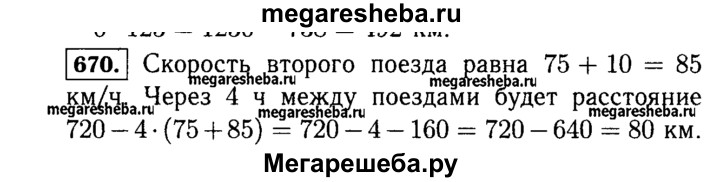 670. С двух станций, расстояние между которыми 720 км, вышли одновременно навстречу друг другу два поезда. Скорость первого поезда 75 км/ч, а скорость второго на 10 км/ч больше. На каком расстоянии друг от друга будут поезда через 4 ч?