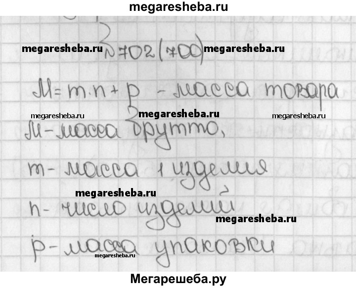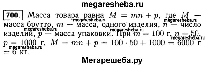 700. Массу М товара с упаковкой (её называют массой брутто) определяют так: вычисляют массу товара (она называется массой нетто) и прибавляют к ней массу р упаковки. Запишите это правило в виде формулы, если масса одного изделия т ив упаковке п изделий. Найдите по этой формуле массу брутто ящика чая, в котором 50 пачек чая, по 100 г каждая, а масса ящика 1 кг.