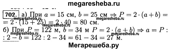 702. Найдите по формуле для нахождения периметра прямоугольника: а) периметр Р, если a = 15 см, b = 25 см; б) сторону а, если Р = 122 м, b = 34 м.