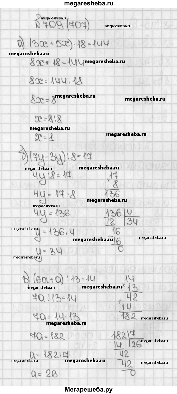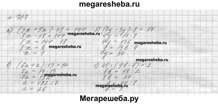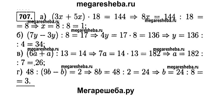 707. Решите уравнение: а) (Зх + 5х) * 18 = 144; б) (7у- Зу) : 8 = 17; в) (6а + а) : 13 = 14; г) 48 : (9Ь -b) = 2.