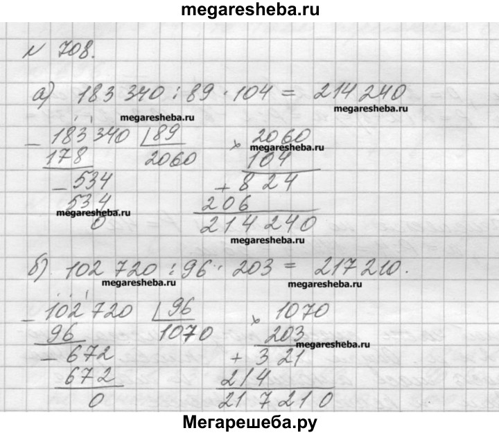 708. Выполните действия: а) 183 340 : 89 * 104; б) 102 720 : 96 * 203.