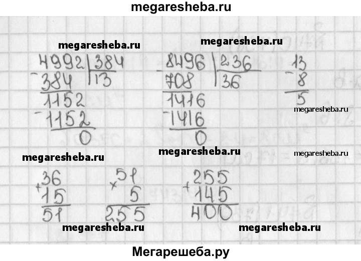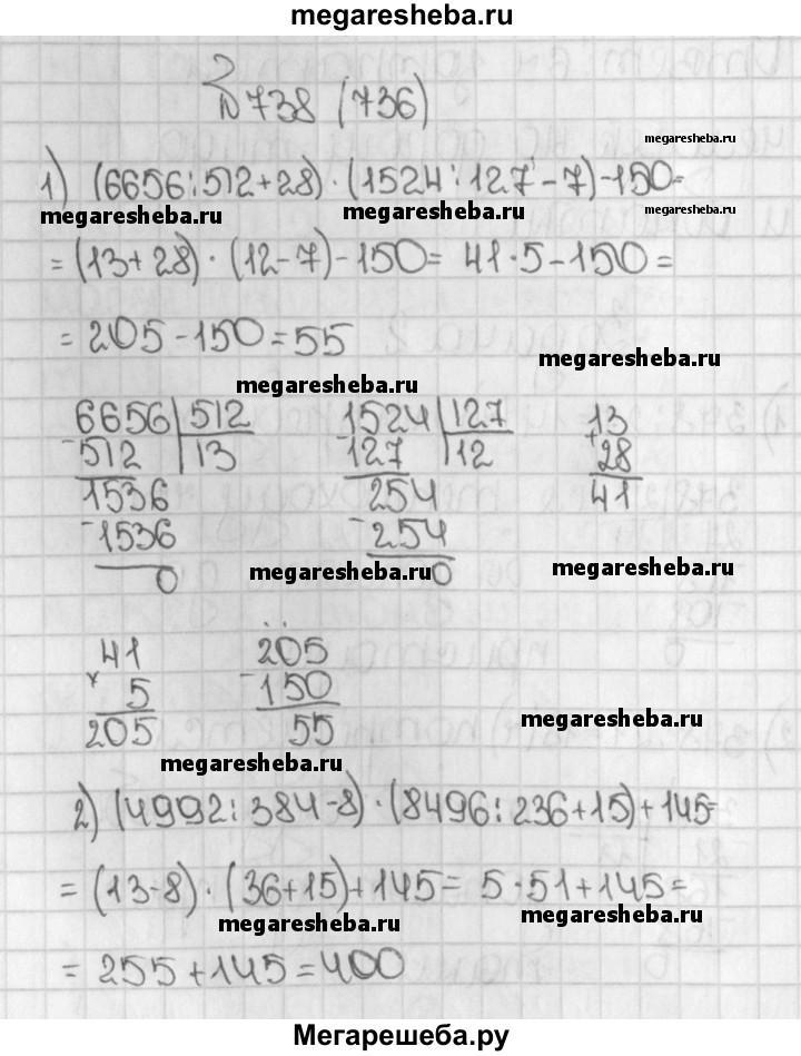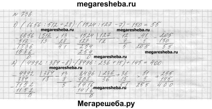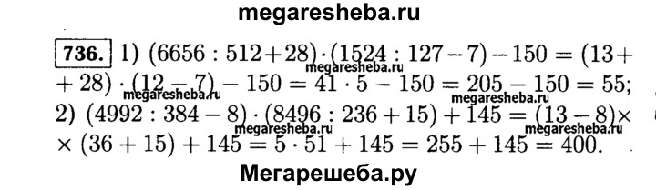 736. Выполните действия: 1) (6656 : 512 + 28) * (1524 : 127 - 7) - 150; 2) (4992 : 384 - 8) * (8496 : 236 + 15) + 145.