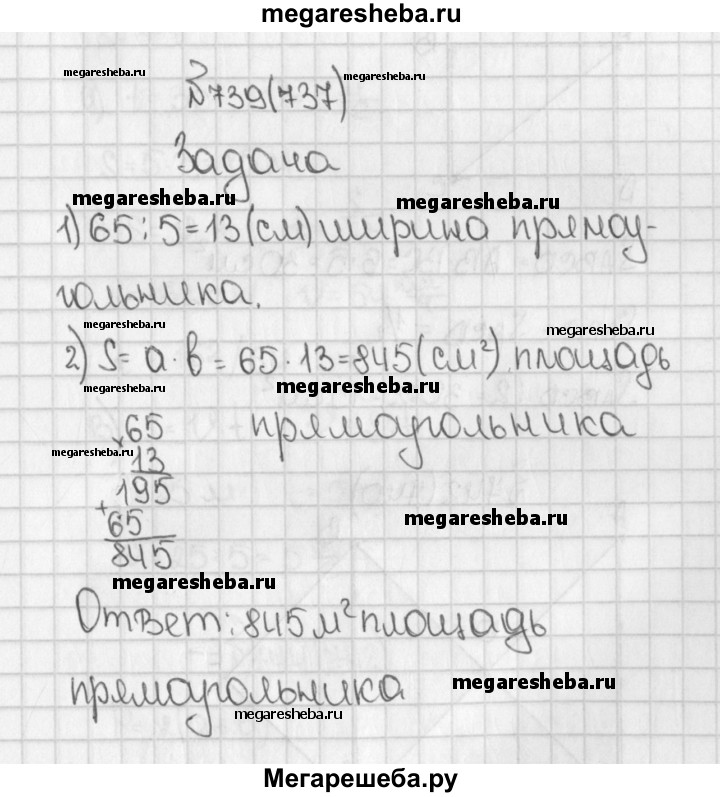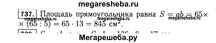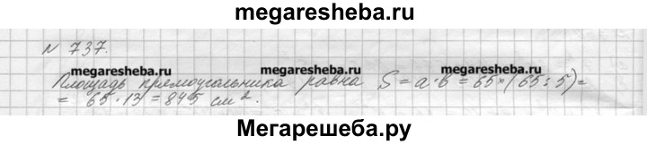 737. Длина прямоугольника 65 см, а его ширина в 5 раз меньше. Чему равна площадь прямоугольника?
