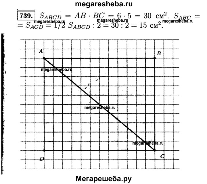 739. Начертите прямоугольник ABCD, соедините отрезком вершины А и С. Найдите площади треугольников ABC и ACD, если АВ = 6 см и ВС = 5 см.