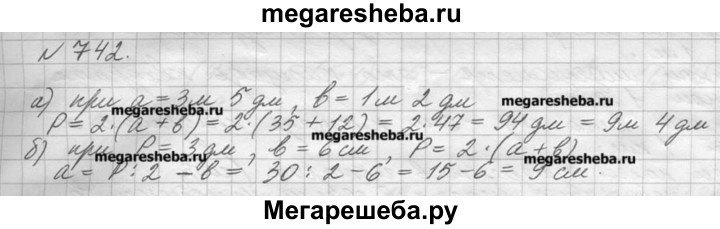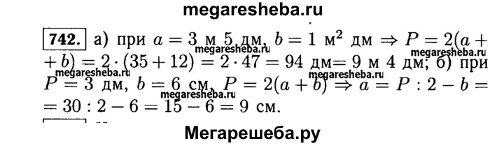 742. Используя формулу периметра прямоугольника Р - 2(а + Ь), найдите: а) периметр Р, если а = 3 м 5 дм, b = 1 м 2 дм; б) сторону а, если Р = 3 дм, b = 6 см.