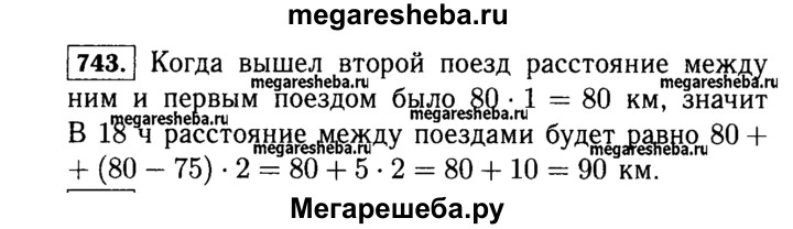 743. В 15 ч со станции вышел электропоезд со скоростью 80 км/ч, а через 1 ч с той же станции вслед за ним вышел второй электропоезд со скоростью 75 км/ч. Какое расстояние будет между ними в 18 ч того же дня?