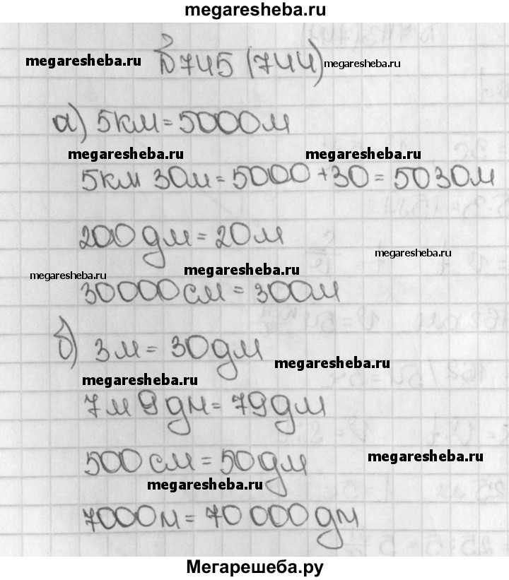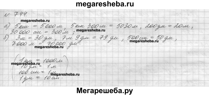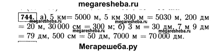 744. Выразите: а) в метрах: 5 км; 5 км 30 м; 200 дм; 30 000 см; б) в дециметрах: 3 м; 7 м 9 дм; 500 см; 7000 м.