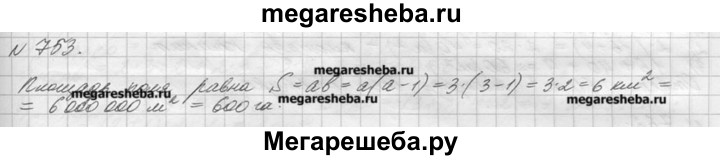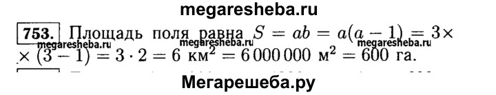 753. Найдите площадь прямоугольного поля, если его длина 3 км, а ширина на 1 км меньше. Выразите эту площадь в гектарах.