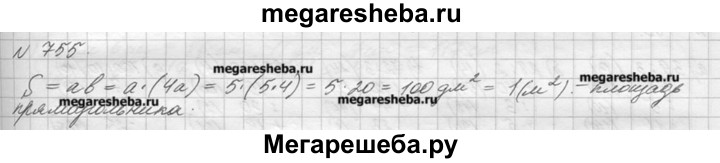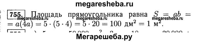 755. Найдите площадь прямоугольника, если его ширина 5 дм, а длина в 4 раза больше. Выразите эту площадь в квадратных метрах.