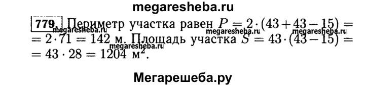 779. Длина прямоугольного участка земли 43 м, а его ширина на 15 м меньше длины. Найдите периметр и площадь участка.