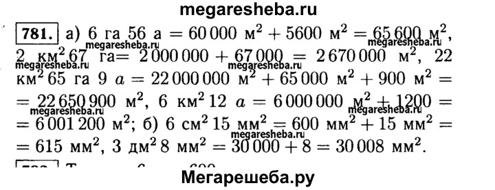 781. Выразите: а) в квадратных метрах: 6 га 56 а; 2 км2 67 га; 22 км2 65 га 9 а; 6 км2 12 а; б) в квадратных миллиметрах: 6 см2 15 мм2; 3 дм2 8 мм2.