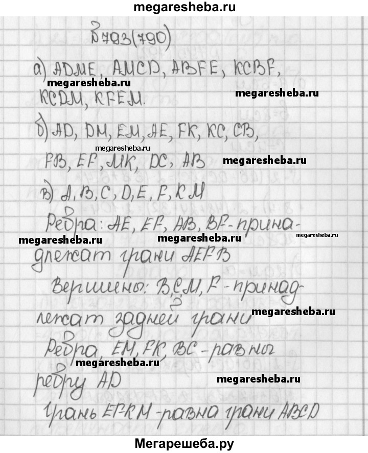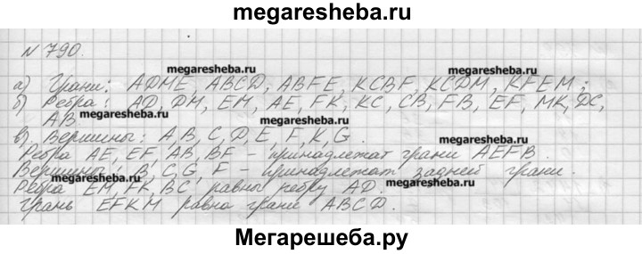 790. Назовите: а) все грани прямоугольного параллелепипеда, изображённого на рисунке 78; б) все рёбра этого параллелепипеда; в) все вершины этого параллелепипеда. Какие рёбра являются сторонами грани AEFB? Какие вершины принадлежат задней грани? Какие рёбра равны ребру AD? Какая грань равна грани ABCD?