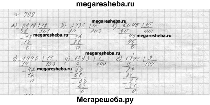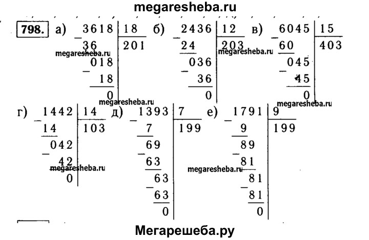 798. Найдите частное: а) 3618: 18; в) 6045 : 15; д) 1393 : 7; б)2436:12; г) 1442 : 14; е) 1791 : 9.