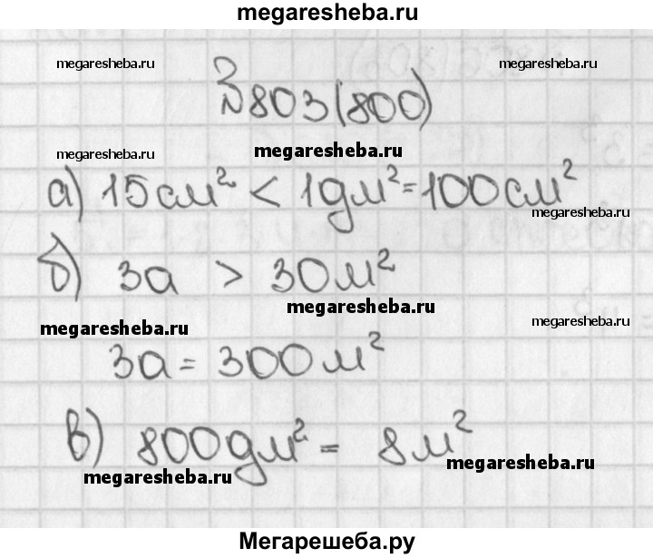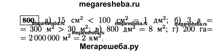 800. Сравните площади: а) 15 см2 и 1 дм2; б) 3 а и 30 м2; в) 800 дм2 и 8 м2; г) 200 га и 2 км2.