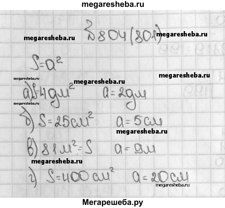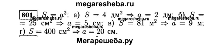 801. Какова длина стороны квадрата, если его площадь: а) 4 дм2; б) 25 см2; в) 81 м2; г) 400 см2?