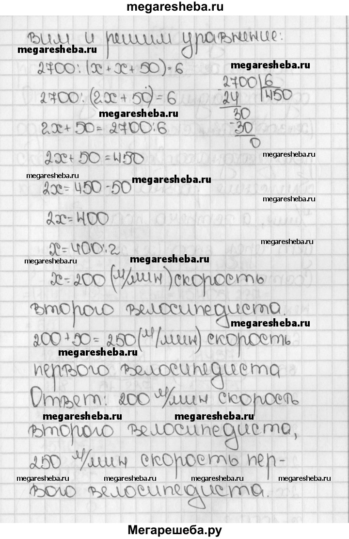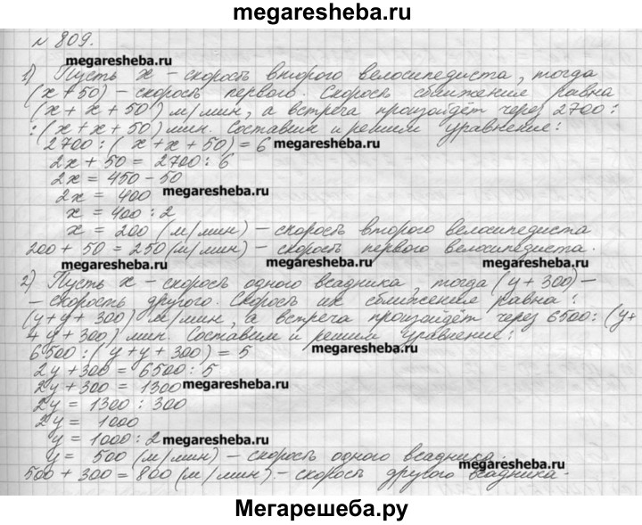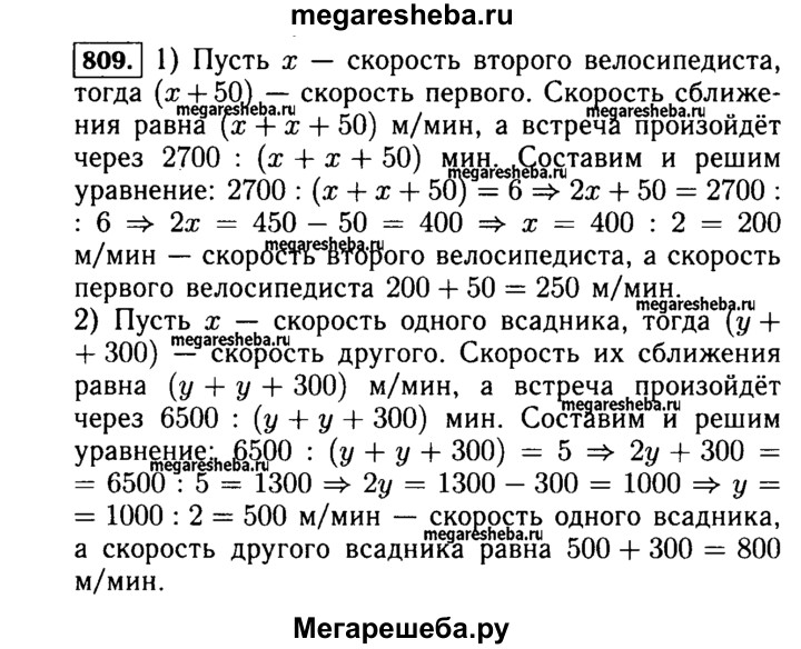 809. Решите задачу: 1) По шоссе едут навстречу друг другу два велосипедиста. Сейчас между ними 2 км 700 м. Через 6 мин они встретятся. Найдите скорости этих велосипедистов, если известно, что скорость первого на 50 м/мин больше скорости второго. 2) Навстречу друг другу скачут два всадника, причём скорость одного из них на 300 м/мин больше скорости другого. Сейчас расстояние между ними 6 км 500 м. Найдите скорость каждого всадника, если известно, что они встретятся через 5 мин.