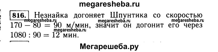 816. Незнайка стал догонять Шпунтика, когда расстояние между ними было равно 1 км 80 м. Незнайка бежал со скоростью 170 м/мин, а Шпунтик шёл со скоростью 80 м/мин. Через сколько минут Незнайка догонит Шпунтика?
