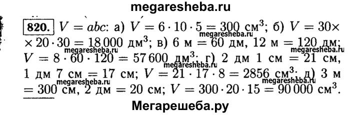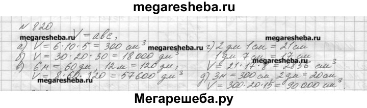 820. Найдите объём прямоугольного параллелепипеда, если: а) а = 6 см, b = 10 см, с = 5 см; б) а = 30 дм, b = 20 дм, с = 30 дм; в) а = 8 дм, b = 6 м, с = 12 м; г) а = 2 дм 1 см, b = 1 дм 7 см, с = 8 см; д) а = 3 м, b = 2 дм, с = 15 см.