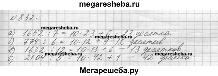 832. Сколько десятков получится в частном: а) 1652: 7; в) 1632 : 12; б) 774 : 6; г) 2105 : 5?