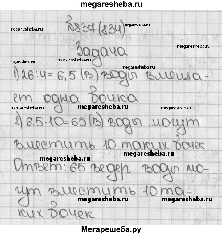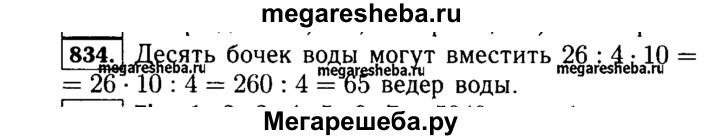 834. Четыре одинаковые бочки вмещают 26 вёдер воды. Сколько вёдер воды могут вместить 10 таких бочек?