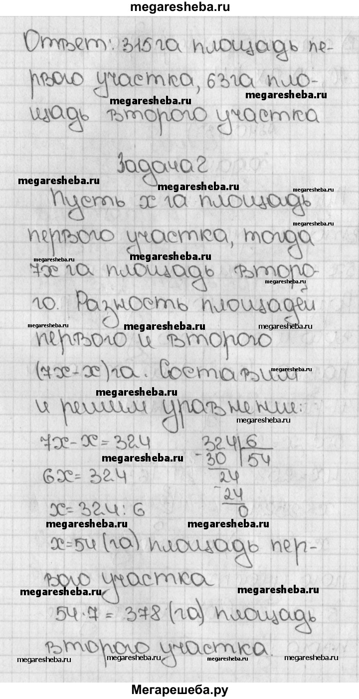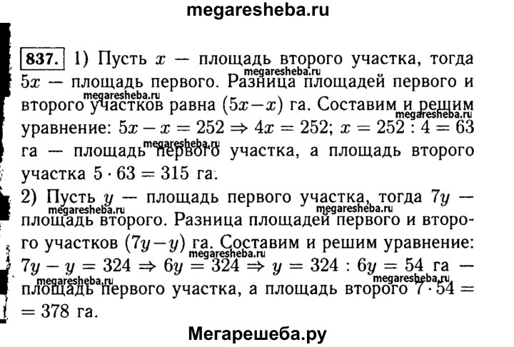 837. Решите задачу: 1) Найдите площадь каждого участка, если площадь первого участка в 5 раз больше площади второго, а площадь второго на 252 га меньше площади первого. 2) Найдите площадь каждого участка, если площадь второго участка на 324 га больше площади первого участка, а площадь первого участка в 7 раз меньше площади второго.