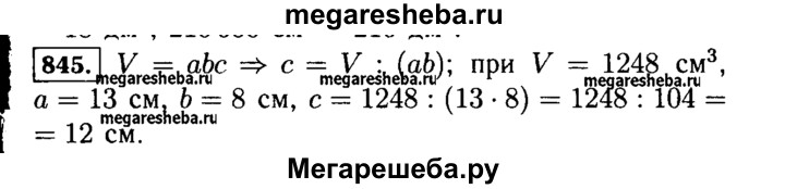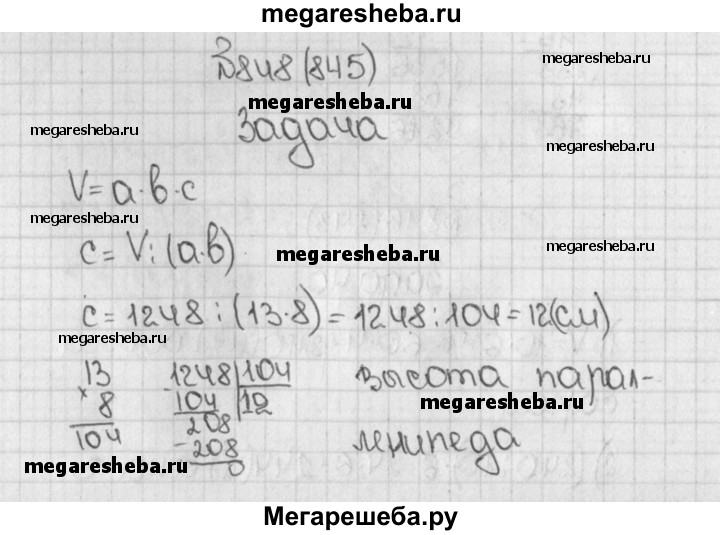 845. Объём прямоугольного параллелепипеда 1248 см3. Его длина 13 см, а ширина 8 см. Найдите высоту этого параллелепипеда.
