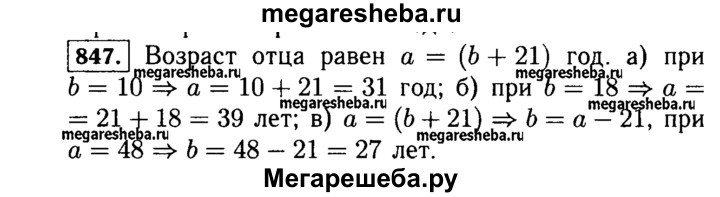 847. Отец старше сына на 21 год. Запишите формулу, выражающую — возраст отца — через b — возраст сына. Найдите по этой формуле: а) а, если b = 10; б) а, если b = 18; в) Ь, если а = 48.