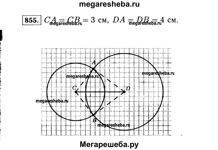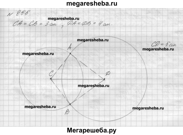 855. Начертите отрезок CD, равный 5 см. Проведите окружность с центром С и радиусом 3 см, а также другую окружность с центром D и радиусом 4 см. Обозначьте точки пересечения окружностей буквами А и В. Чему равны длины отрезков AC, СВ, DA и BD?