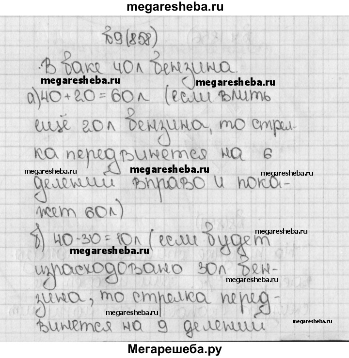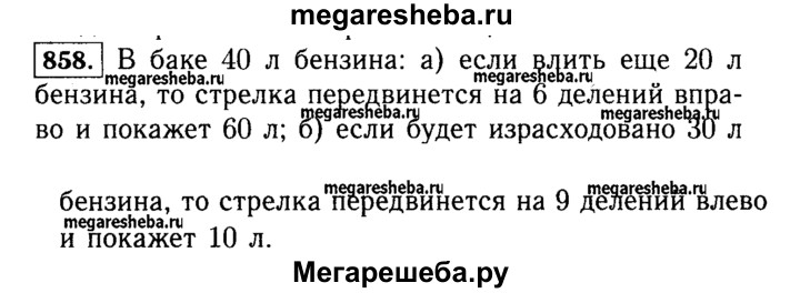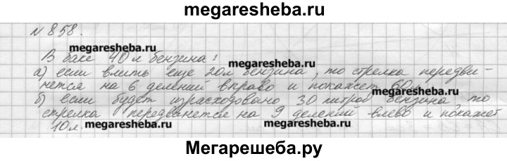858. На рисунке 99 изображена шкала прибора, показывающего, сколько литров бензина осталось в баке автомобиля. Сколько литров бензина сейчас в баке? На сколько делений и в какую сторону передвинется стрелка прибора, если: а) в бензобак нальют ещё 20 л бензина; б) при движении будет израсходовано 30 л бензина?