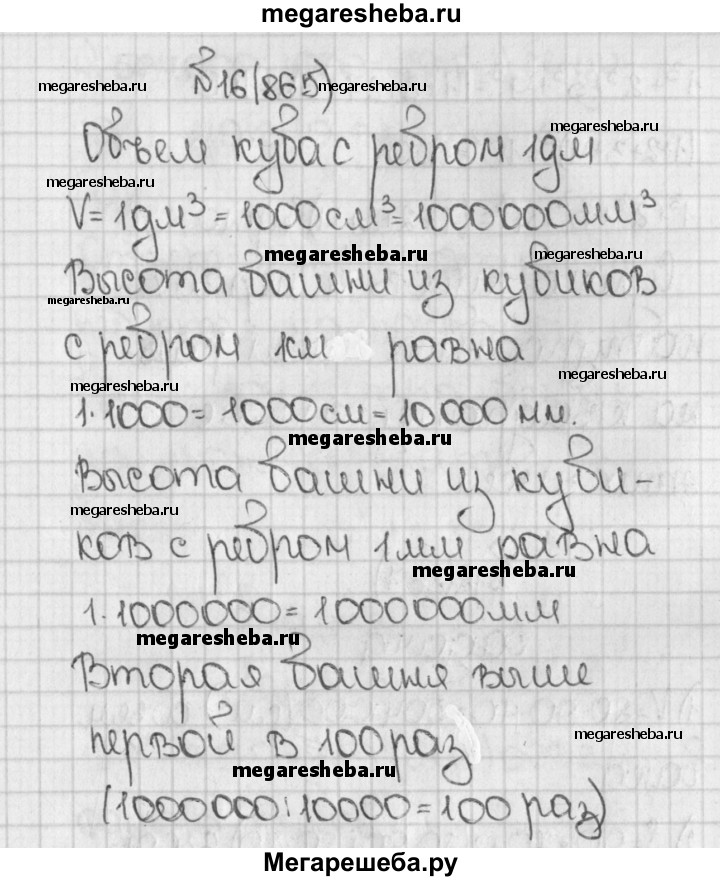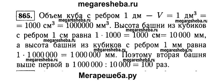 865. Представьте себе, что один куб с ребром 1 дм разрезали на кубики с ребром 1 см и из этих маленьких кубиков сложили башню, поставив их один на другой. Второй куб с ребром 1 дм разрезали на кубики с ребром 1 мм и из этих кубиков так же сложили башню. Какая из этих башен выше? Во сколько раз?